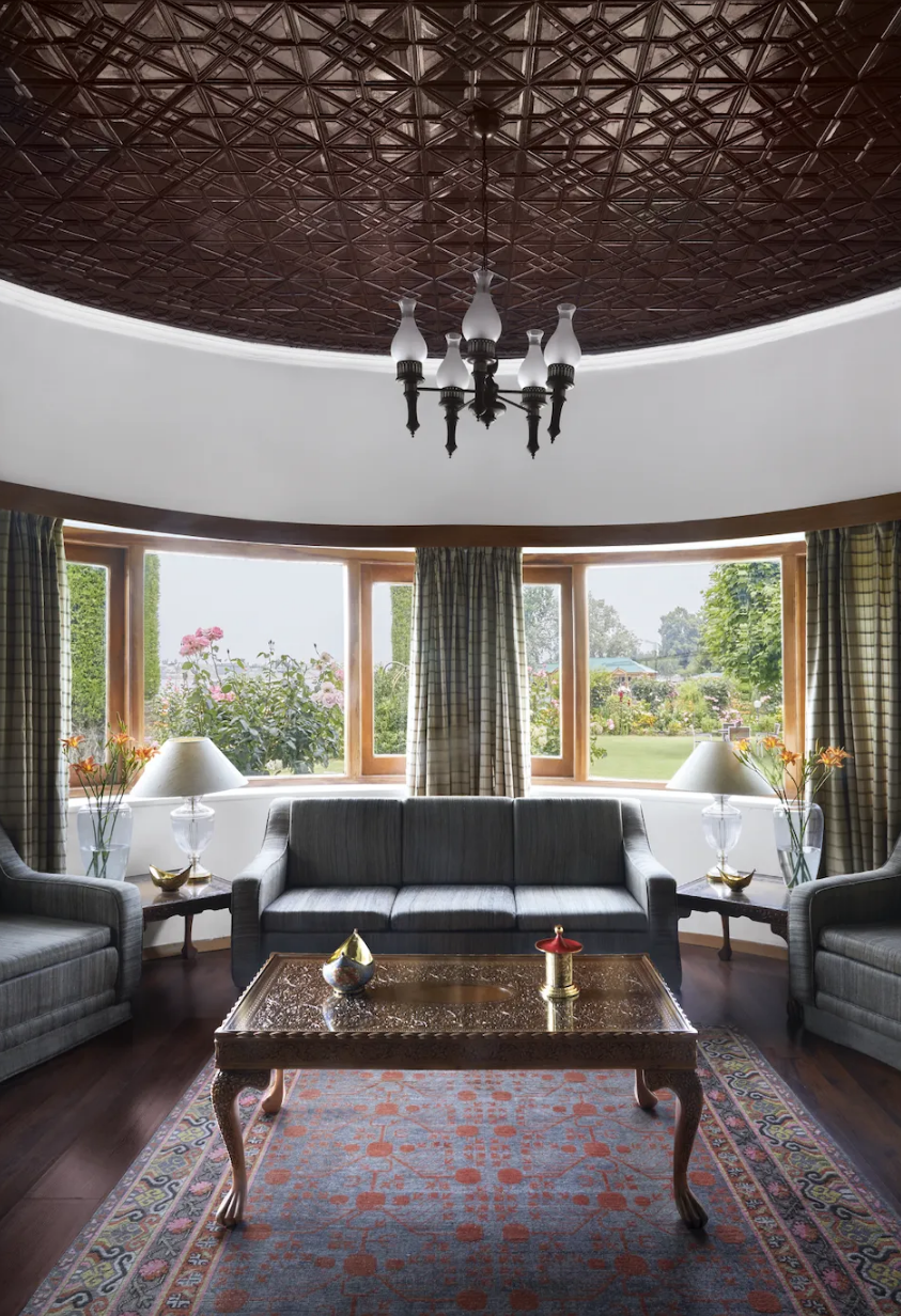 Historically, Kashmir has had Persian, Mughal and British influences in architecture. Classic mountain chalets are common across the valley, but art deco was unusual. “There wasn’t an architect on the project that we know of. It was my grandfather’s vision. He was well-travelled; he worked for the government, and I’m sure he had friends who came on board for the design and construction,”—which is technically solid. The entire grand structure sits on a foundation of wooden beams bored into the soil—a technique called piling, which is common to homes built close to water bodies. The interiors are an exquisite theatre of Kashmiri workmanship. Khatamband ceilings were carved in deodar—a technique of geometric wood blocks, fitted together like a jigsaw puzzle. Persian rugs, ornate walnut-wood bars and consoles, carved detailing on furniture, brass, copper and silverware, and papier mâché objets—Dar-Es-Salam is heaven for anyone with a weakness for Kashmiri craftsmanship. So who were these masters who created these glorious interiors? “I asked my father about that. And he reminded me how much of a taskmaster my grandfather was. Not the most patient man. So I believe there were a string of artisans who came and went!” laughs Khurram, whose father, Musadiq Hussain, must be credited for the eye he lent to creating the interiors. “He handpicked all the furniture, chose all the upholstery, and placed the artwork—even the garden is all his attentive care,” adds Khurram.