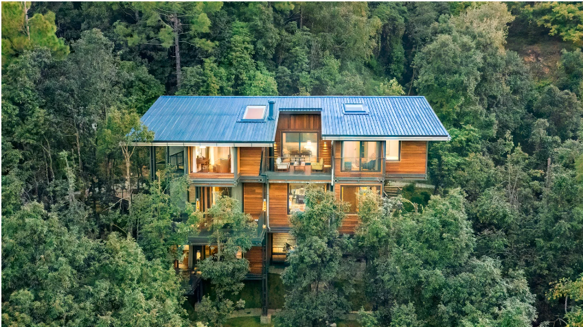 The firm’s other entry, the Villa in the Woods, is part of an eco-conscious community development project set at a lofty 6,700 feet in the Kumaon range of the Himalayas in Uttarakhand. Mindful of its environmental impact, the tree house–like structure features modernist angles and clean lines while the material palette borrows from traditional Kumaoni practices and includes timber, slate and local stone.