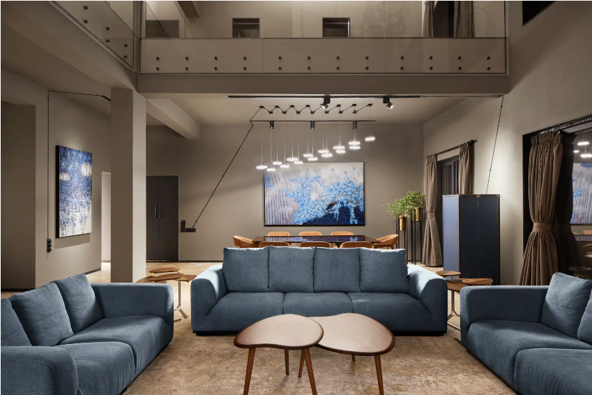A mushroom grey tone dominates the facade of the 5,000-square-feet building, and a black entrance reveals a double-heighted living room which makes the home appear more voluminous. The ground floor also has two bedrooms, a dining room, a private cinema with a separate pantry and powder room, and porch.