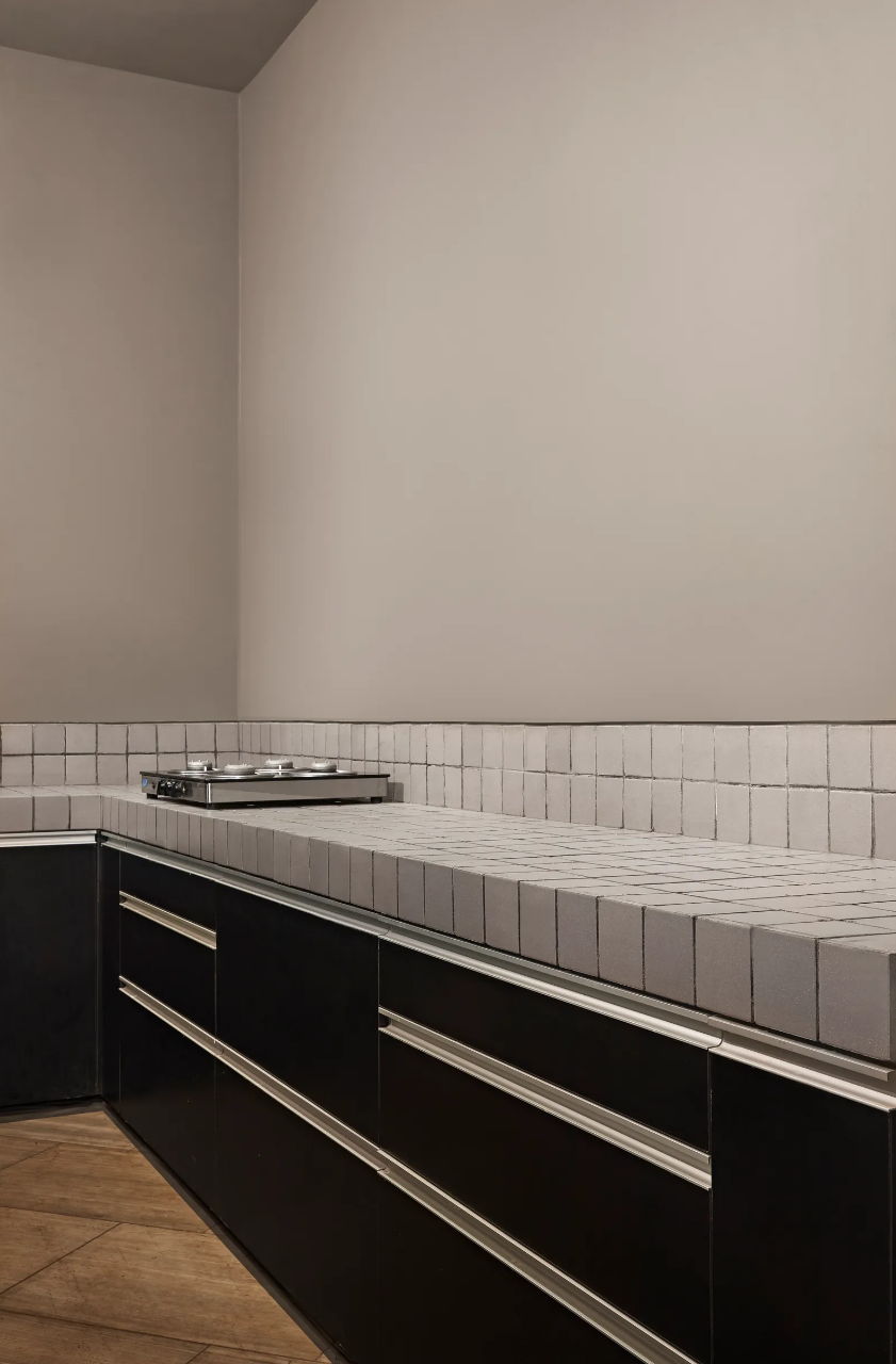 The kitchen builds on the sustainable philosophy of the house—the counters, for example, have been made from leftover paver blocks. Dark coloured cabinets by Confido Home complement the mushroom grey on the walls, a continuation of the house’s monotone exterior.