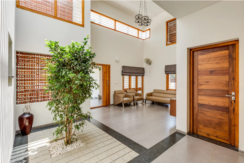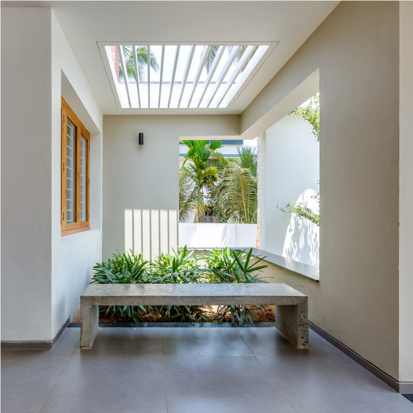 Through the external veranda, the wind flows into the internal courtyard that was imagined as the 'lungs' of the house. 'Jalli' screens were added to make the space more 'breathable'. Apart from adding to the aesthetic value, these screens also aid ventilation by bringing in cool breeze and letting out the warm breeze. The internal courtyard can be easily accessed from all the rooms of the house making it the perfect communal spot.